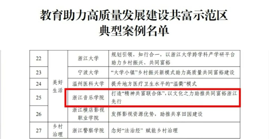 《打造“精神共富联合体”,以文化之力助推共同富裕浙江先行》案例,充分展示了我校发挥音乐学科专业与人才艺术资源优势,以精神共富联合体建设为抓手,聚焦优质文艺和音乐教育资源供给,通过文艺赋美、人才赋能、教育赋智、产业赋兴等组合拳形成“5+1”服务创新模式,有效链接高校艺术资源与基层文化需求,为教育助力高质量发展建设共同富裕示范区探索了新路径、提供了新典型。