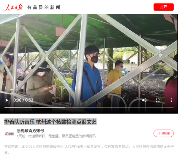 人民日报:排着队听音乐 杭州这个核酸检测点很文艺