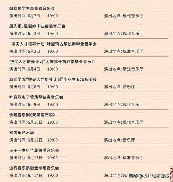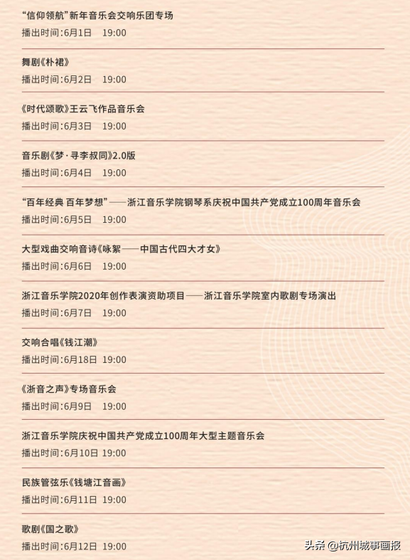 艺术周期间,浙音将首次与网络平台合作开展音乐精品展播活动,集中展现建校以来学院创作的12场大型文艺演出精品,其中包括浙音首部原创歌剧《国之歌》、原创音乐剧《梦·寻李叔同》、原创舞剧《朴裙》等。与此同时,浙音拔尖人才培养机制——叔同学院毕业生音乐会,以及浙音国家艺术基金2020年度艺术人才培养资助计划汇报音乐会也将在浙音校园及浙江音乐厅、杭州运河大剧院上演,市民观众可通过线上线下方式,尽享浙音师生带来的音乐盛宴。