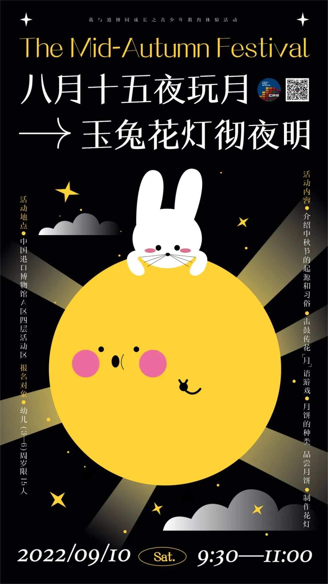 活动简介:中秋节是中国传统节日之一,以月之圆兆人之团圆,为寄托思念故乡,思念亲人之情,祈盼丰收、幸福,成为丰富多彩、弥足珍贵的文化遗产。在这月圆之下,做一盏玉兔灯,一起热闹过中秋。