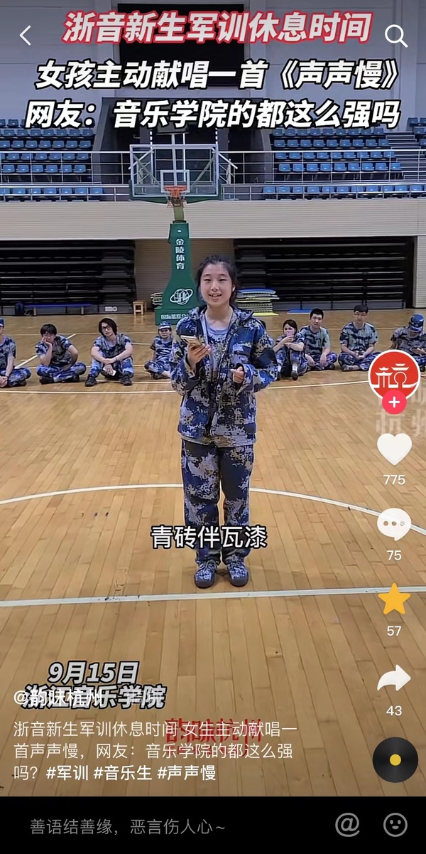 新闻来源:5..:/ -复制打开抖音,看看【韵味杭州的作品】浙音新生军训休息时间 女生主动献唱一首声声慢,网友... ЮD2eP2iQONv8Ю (复制链接,打开抖音观看)