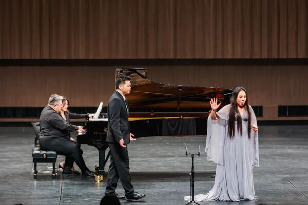 威尔第是19世纪意大利歌剧复兴时期最具代表性的歌剧作家。他一生创作了《茶花女》《弄臣》《阿依达》《奥塞罗》等26部歌剧。孙秀苇演出的首部歌剧就是威尔第的《茶花女》,之后在她的歌剧生涯中,她演唱过《阿依达》《游吟诗人》《麦克白》《纳布科》等威尔第歌剧。今年是威尔第诞辰210周年,孙秀苇与杨小勇希望通过音乐会的形式,把威尔第一生中各个时期的代表性佳作以音乐会的形式呈现给浙音师生。音乐会最后,他们甚至直接把《阿依达》第三幕搬上舞台。尽管台上只有一架钢琴,但罗曼·克鲁莫夫的演奏给予演唱者们强有力的支撑。两位老师挑选了浙音歌剧学院中的优秀学生并与他们同台演出,为学生们提供了一次重要的学习、展示机会。孙秀苇表示,“威尔第的作品并不是什么嗓子都唱的,此次选择的学生,都是适合演唱威尔第作品的学生。”