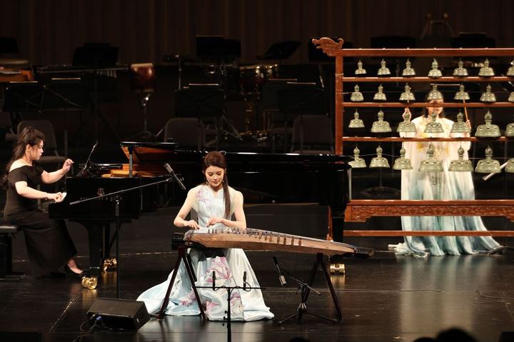 音乐会下半场由国家一级指挥、中央民族乐团首席指挥刘沙执棒,浙江交响乐团协奏。古筝协奏曲《望云赋》为纪念秦筝陕西流派领军人周延甲先生而作,运用《秦桑曲》《百花引》的乐思,结合交响乐的重新编配,深情抒发了对亲人的缅怀及追思之情。琵琶协奏曲《春秋》由著名作曲家唐建平创作,是中国当代最具代表性的琵琶协奏曲之一,乐曲气势宏大,内涵深刻,借“春秋”为题,抒发今日国人对民族古老、辉煌的文化成就的无限尊崇与赞颂。音乐会尾声是谭盾的《琵琶与古筝双重协奏曲》,该作品改编自其为美国Kronos四重奏创作的一部多媒体弦乐四重奏歌剧《傩戏》,分为“粗旷又幽雅的行板”“乡土却自由的快板”“巴赫与小白菜的柔板”“野性快板与爱的慢板”四个乐章,来表现幽灵与人的对话、山与水的对话、灵魂与生命的对话,充满了浓郁的中国色彩,以及现代与传统交织融合的音乐风格。