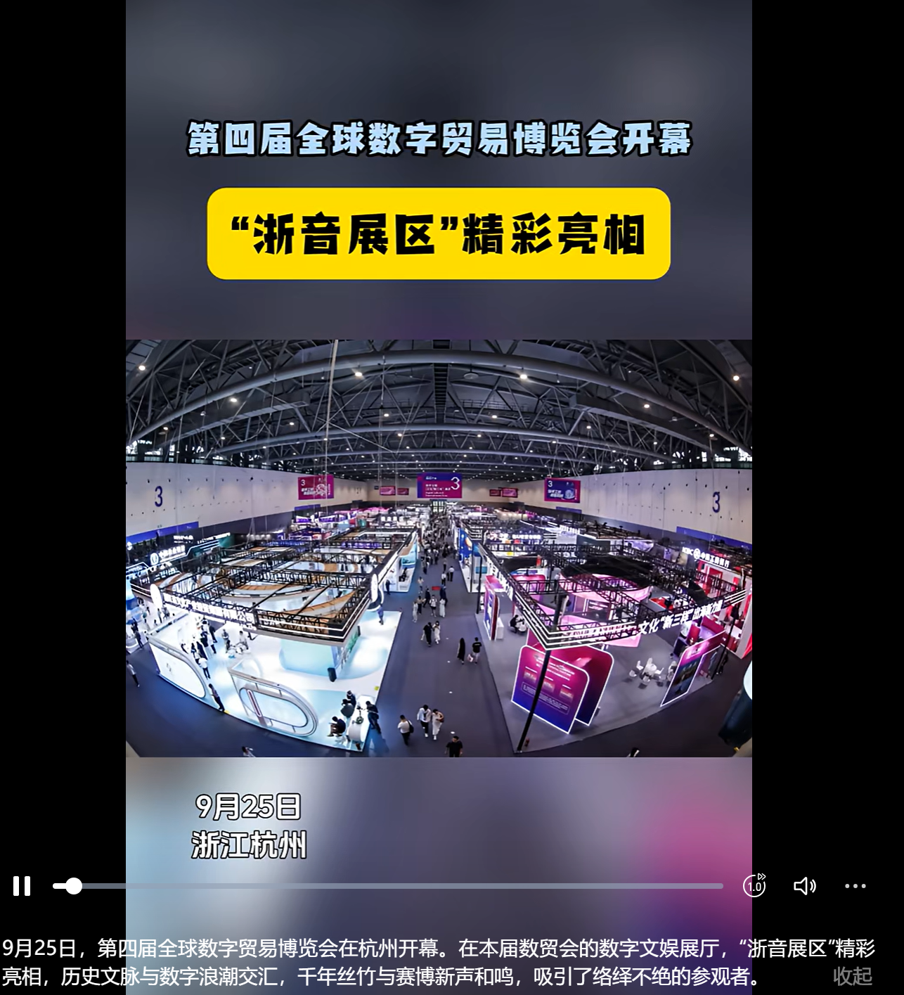教育之江:9月25日,第四届全球数字贸易博览会在杭州开幕。在本届数贸会的数字文娱展厅,“浙音展区”精彩亮相,历史文脉与数字浪潮交汇,千年丝竹与赛博新声和鸣,吸引了络绎不绝的参观者。