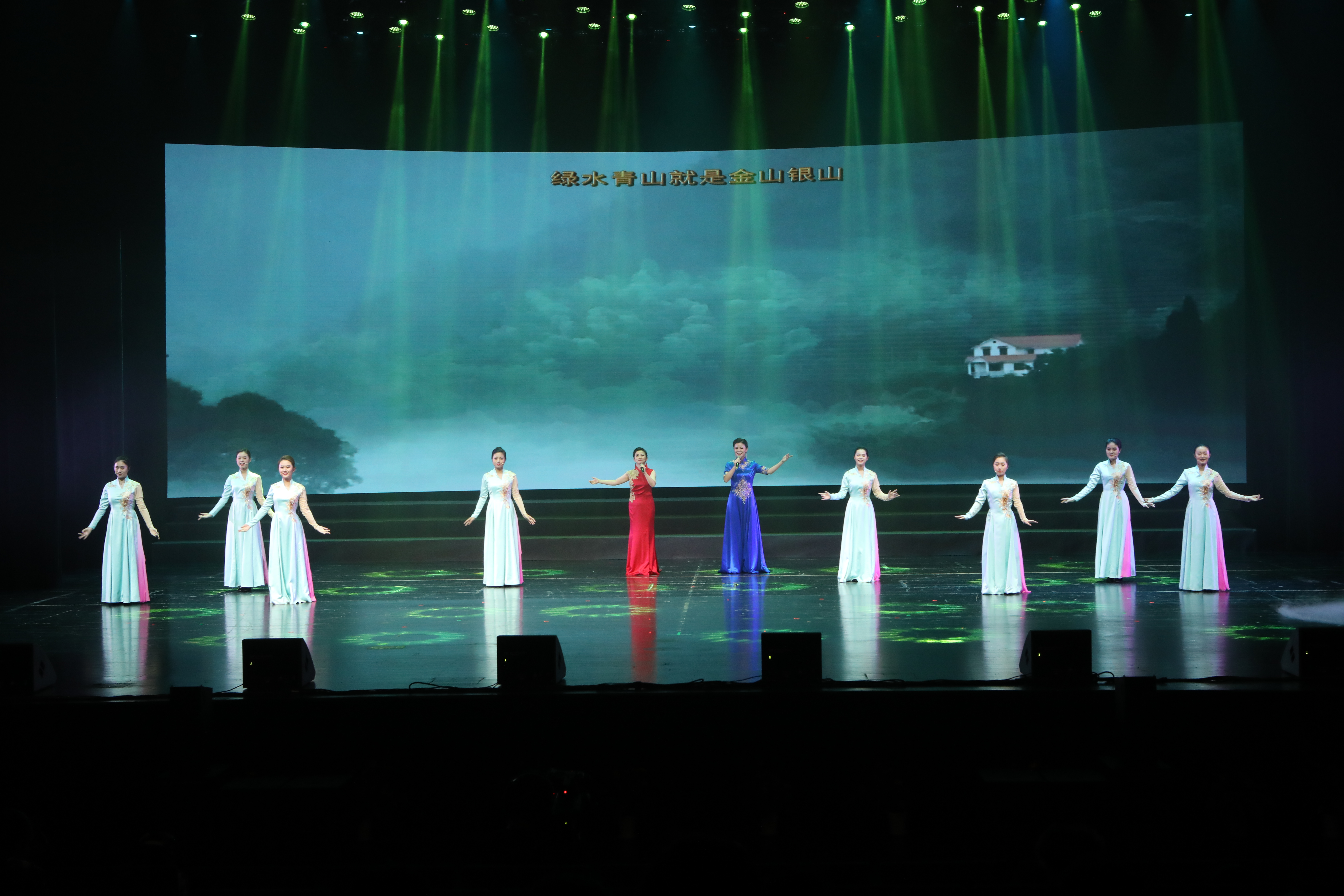 第二篇章“绿水青山”,笛子演奏《帕米尔的春天》、男生独唱《赞歌》、钢琴即兴演奏《山河写意》,描绘“东方风来满眼春”的神州大地,礼赞中华人民共和国成立七十载的流金岁月,一曲《绿水青山》,抒发了浙江作为中国革命红船起航地、改革开放先行地、习近平新时代中国特色社会主义思想重要萌发地的自豪与担当。