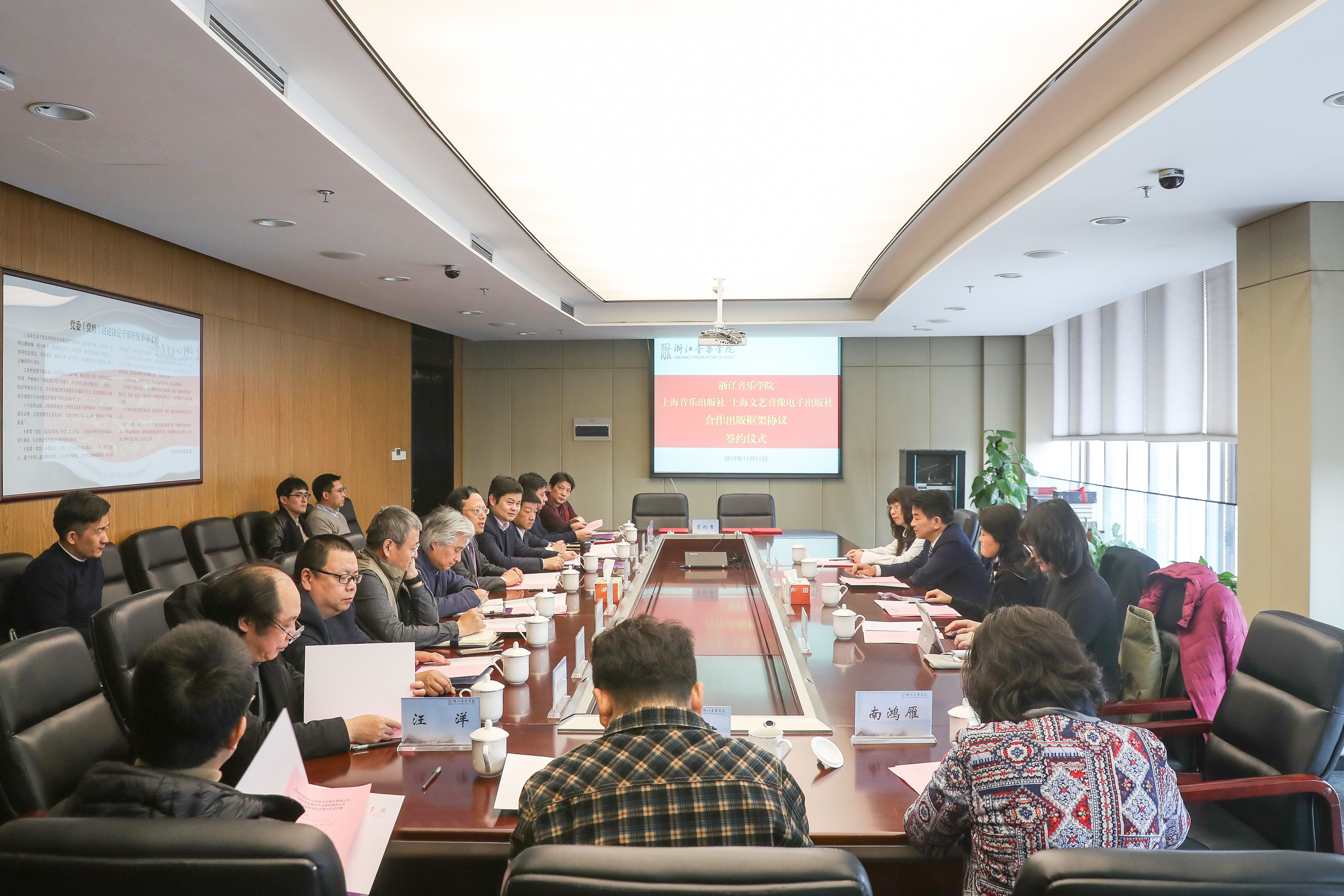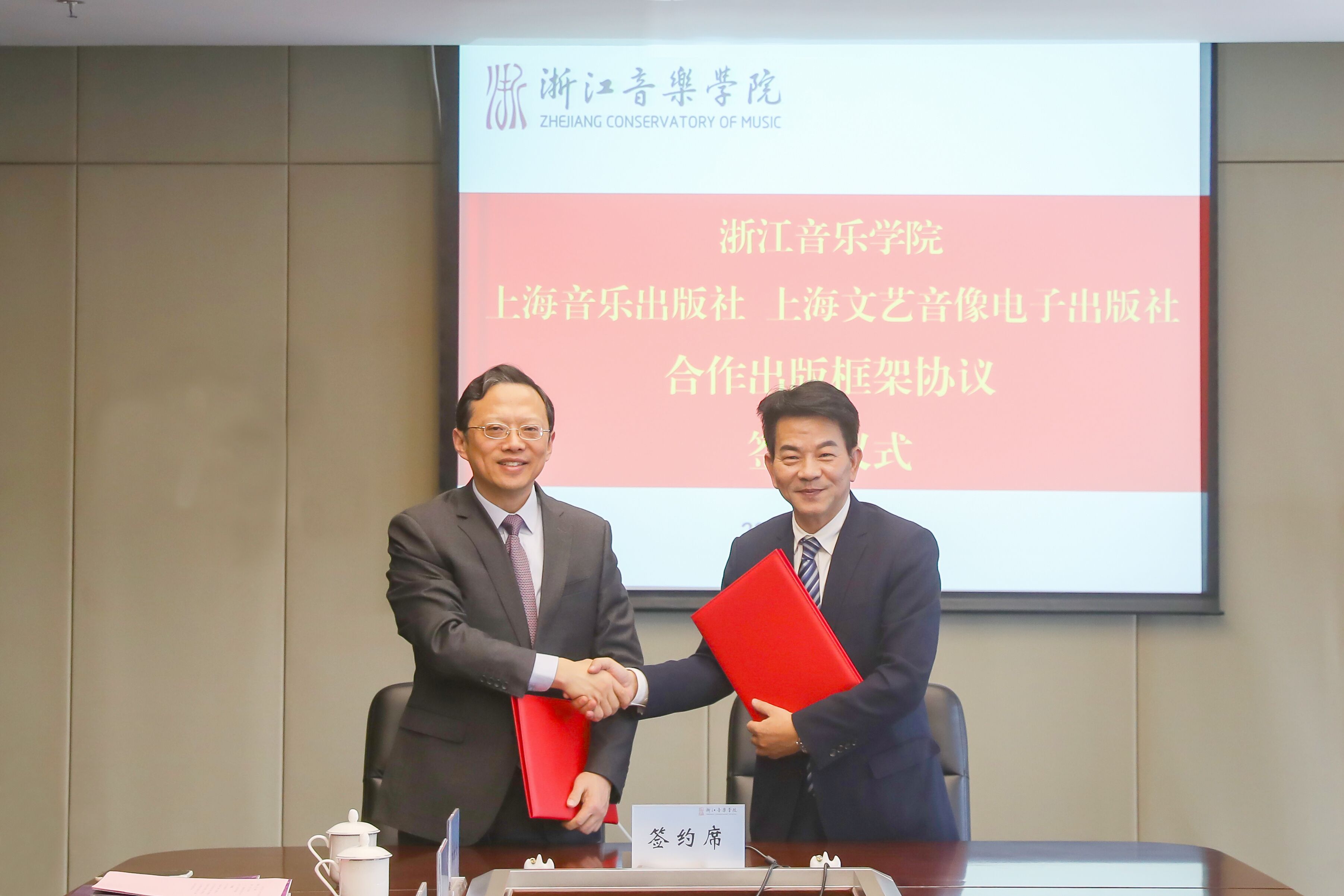 签约仪式上,王瑞代表学院对上海音乐出版社、上海文艺音像电子出版社领导一行的到来表示热烈欢迎。他指出,上海音乐出版社作为全国创办最早的专业类出版机构之一,拥有较强的专业策划与发行能力,以及庞大的国内外合作网络与艺术家资源,推出了一大批有水准、有内涵、有影响、有前瞻性的作品。浙音当前已进入全面推进内涵建设时期,此次三方合作必将推进校企产教精准对接,推动学院学科建设、科研创作与出版事业健康快速可持续发展,加快助推学科资源、人才资源、艺术资源向社会服务资源转化,通过强强联合,构建产学研紧密合作的新型战略关系,共同推动浙江乃至全国音乐高等教育事业与音乐文化产业的新发展。