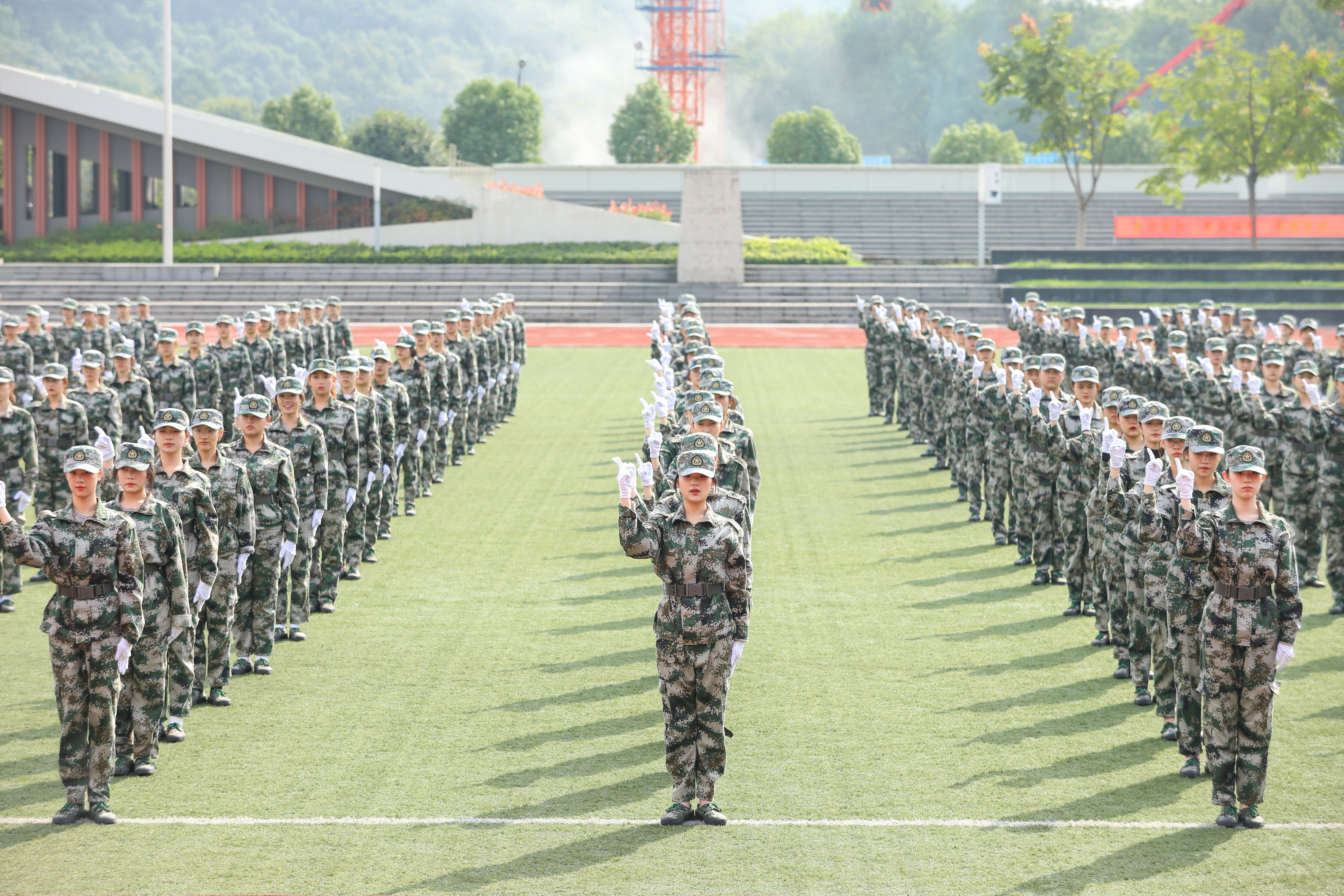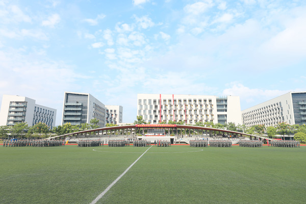 现场,参训新生迈着铿锵有力的步伐、喊着响亮的口号进行了分列式表演。整齐的动作、坚定的目光、嘹亮的口号,展现出浙音新生昂扬的风貌和过硬的素质。近200名男生进行了百人军体拳,他们将拳打、脚踢、摔倒、夺刀等格斗动作展现得淋漓尽致。近400名女生组成花样列队操,变化展示着“I love ZJCM”字体和《志成学子之歌》的手语操,整齐化一的动作、嘹亮的番号声,充分展现了年轻浙音学子们不折不挠、事必尽善的团队精神,赢得与会领导和在场观众的阵阵掌声。