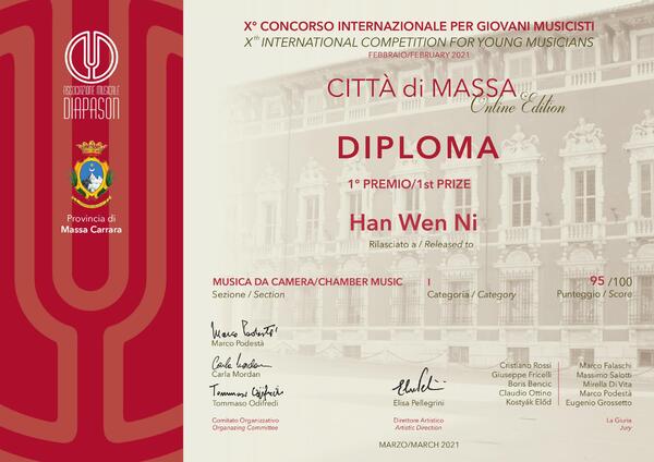 据悉,马萨第十届国际青年音乐家比赛由Diapason国际音乐家协会与马萨省政府联合举办,旨在发掘青年演奏家的音乐天分,通过比赛不断提升其专业演奏水准。评委由来自意大利、美国、德国、法国、斯洛文尼亚等多个国家的优秀演奏家组成。