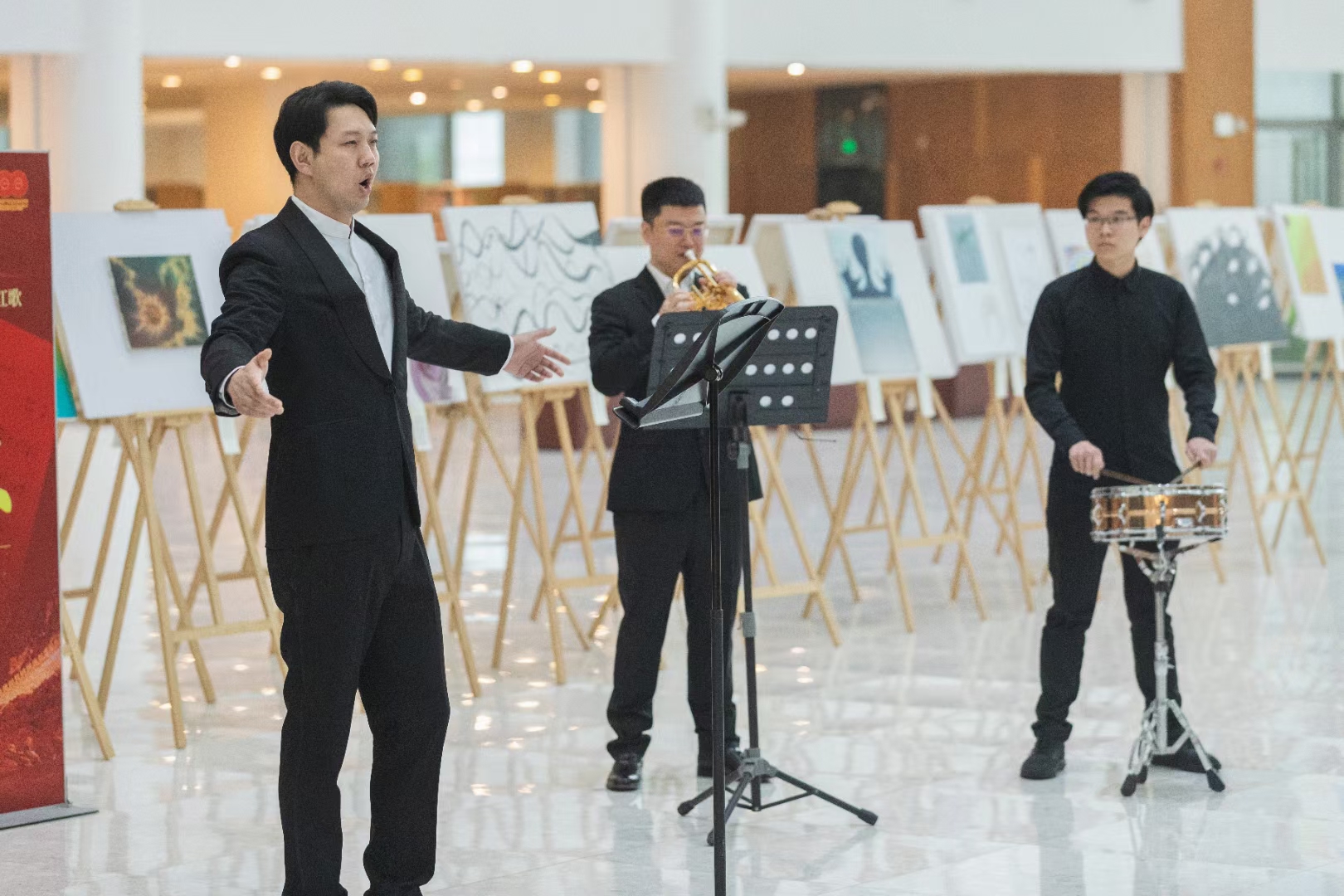 作品《伟大》系统描绘了嘉兴南湖“一大”、南昌起义、井冈山革命、红军长征、抗日战争、解放战争、新中国成立、改革开放,以及“一带一路”倡议等中国共产党重要历史时期,立体全面地展现了党的百年辉煌历程。《伟大》词曲由图书馆吴涤老师创作,作品旋律的引子和尾声部分融合了国歌《义勇军进行曲》的元素,高潮旋律则采用了《国际歌》的主题变奏手法,整部作品节奏鲜明、大气磅礴,既保留了进行曲风格的节奏律动特点,也融合了主旋律颂歌风格的庄严辉煌氛围,为听众描绘出一幅伟大的中国共产党百年风雨、不断前进、史诗般波澜壮阔的革命音乐画卷。《伟大》首发仪式由声乐歌剧系教师吴宇担任艺术指导,声乐歌剧系教师刘涛演唱,管弦系教师刘一担任小号演奏,国乐系学生宋易非担任打击乐演奏。现场,师生对作品给予了高度评价,纷纷表示该作品对开展党史学习教育具有重要的现实意义。