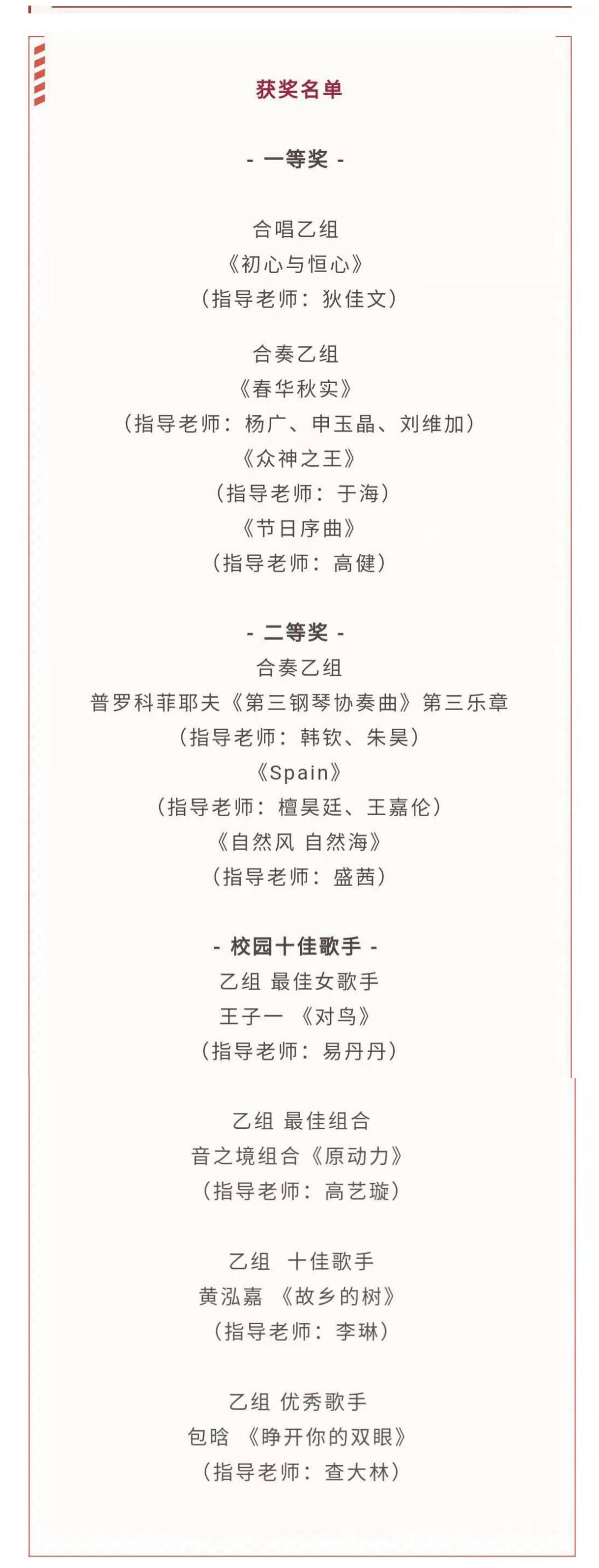 日前,2021年浙江省大学生艺术节圆满落幕,学院共有24个节目参加此次艺术节的比赛。经过专家评审,由学院师生带来的合唱《初心与恒心》、民族管弦乐合奏《春华秋实》、交响乐《节日序曲》、管乐合奏《众神之王》4个节目获得一等奖;钢琴演奏普罗科菲耶夫《第三钢琴协奏曲》第三乐章、爵士乐团合奏《Spain》、古筝合奏《自然风 自然海》等节目获得二等奖。音乐教育学院学生王子一获得最佳女歌手奖,流行音乐系音之境组合获得最佳组合奖和十佳歌手奖,声乐歌剧系学生黄泓嘉获得十佳歌手奖,音乐教育学院学生包晗获得优秀歌手奖。与此同时,学院还荣获2021浙江省大学生艺术节优秀组织奖。