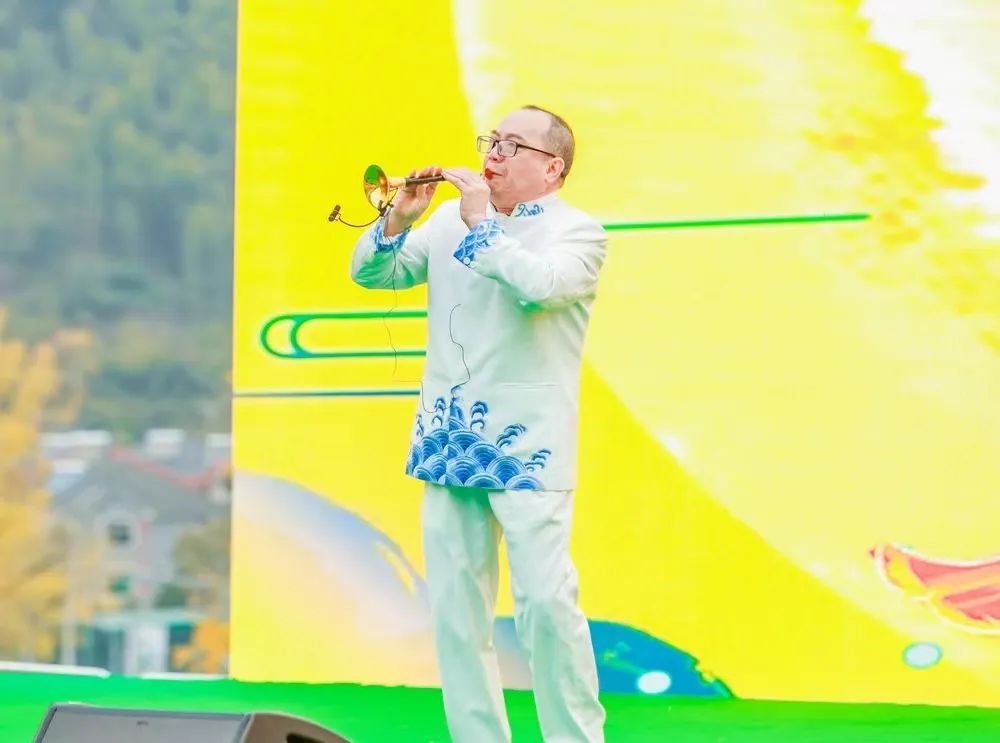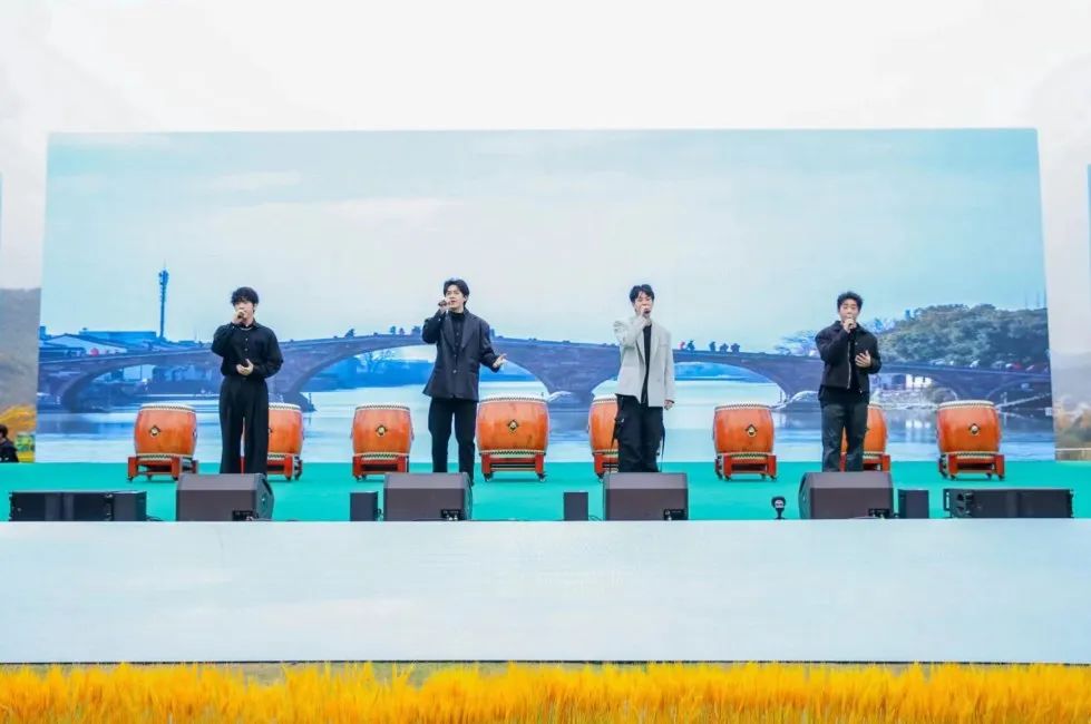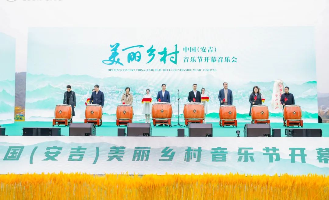 干武东宣布开幕。干武东、杨卫东、戴爱萍、邱见春、王均寅、何晓红、奚丽萍、管永丰共同击鼓启动首届中国(安吉)美丽乡村音乐节。