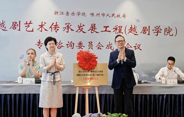 王瑞、潘超英为越剧艺术传承发展工程(越剧学院)专家咨询委员会揭牌。