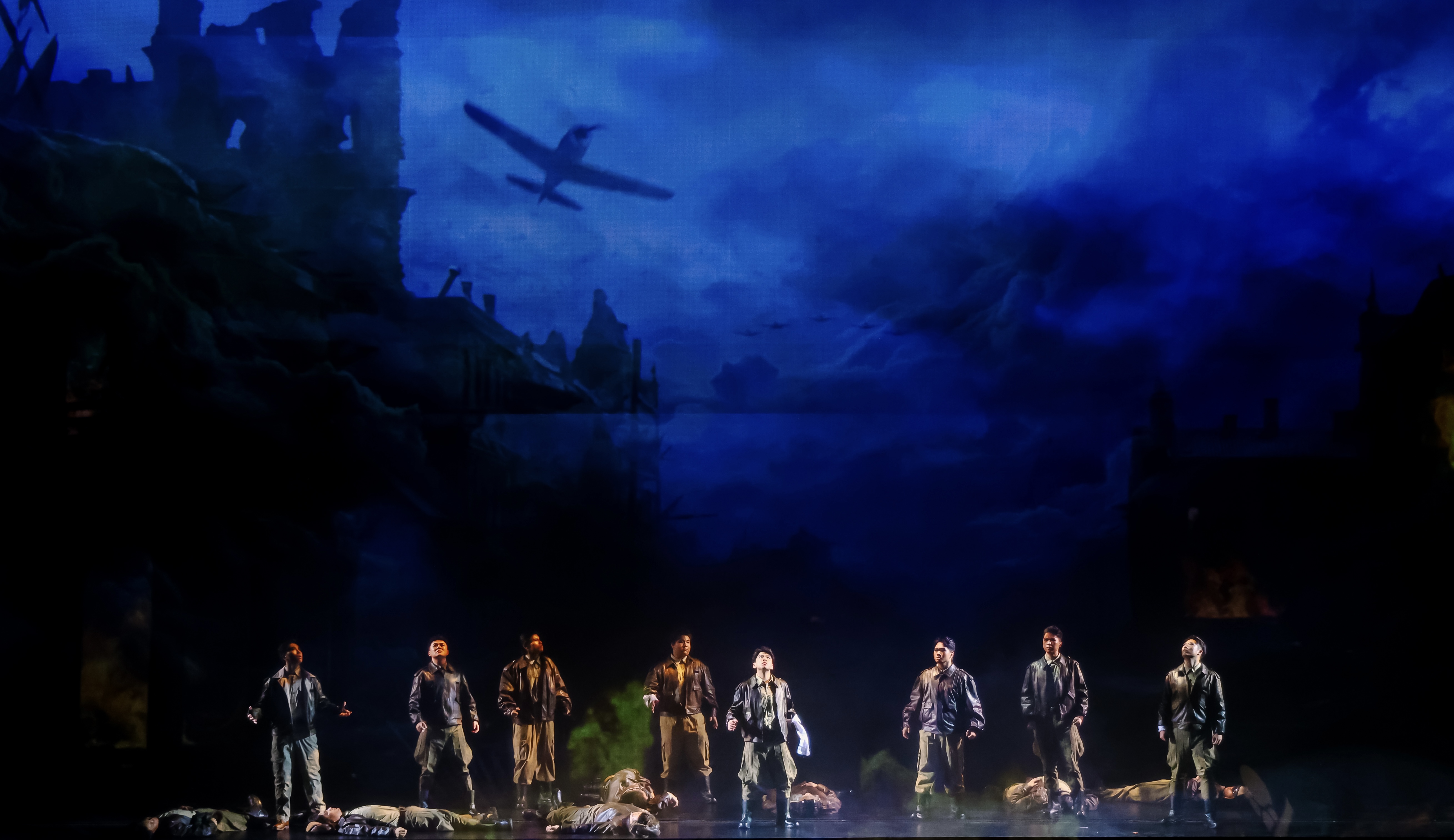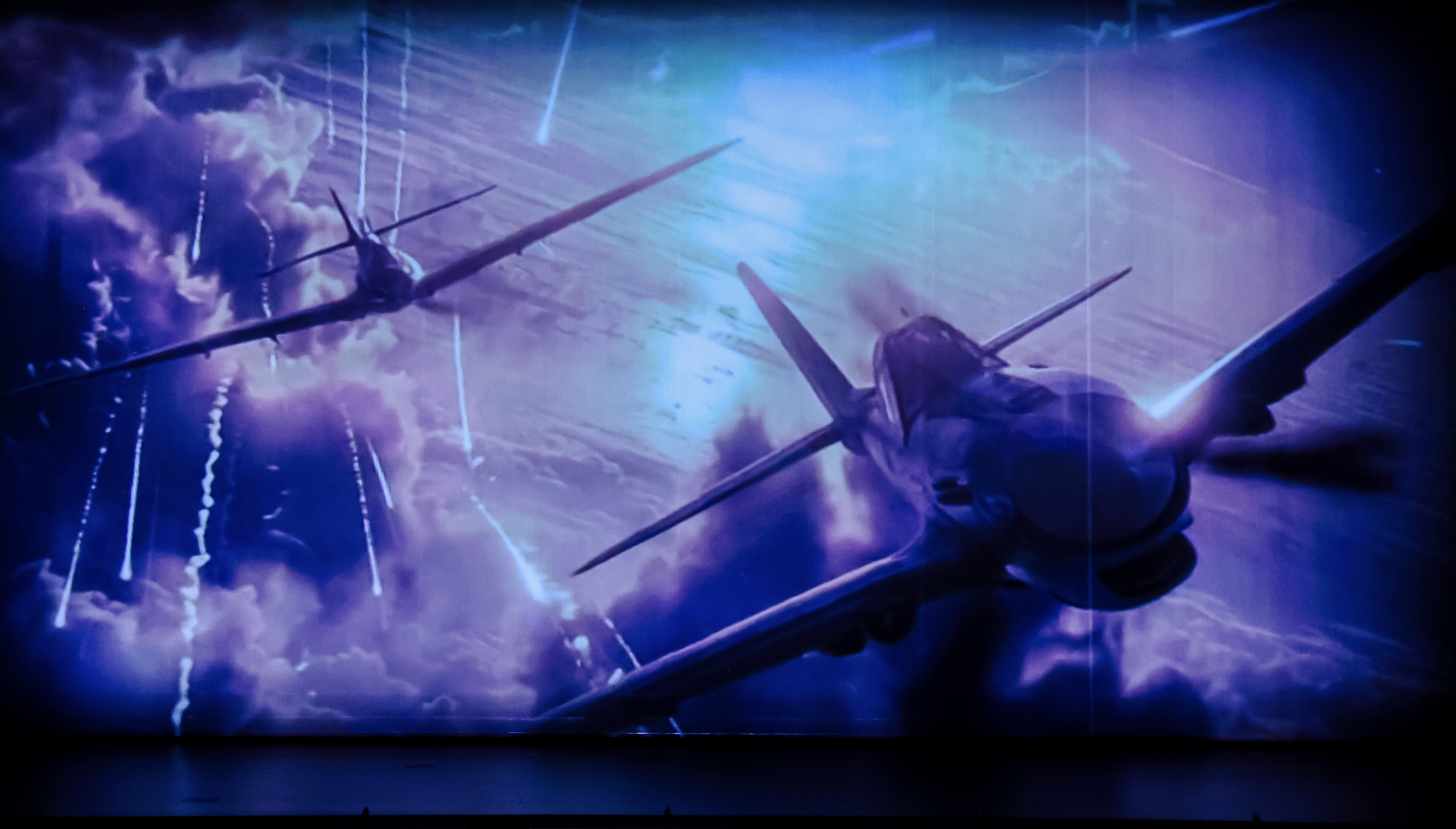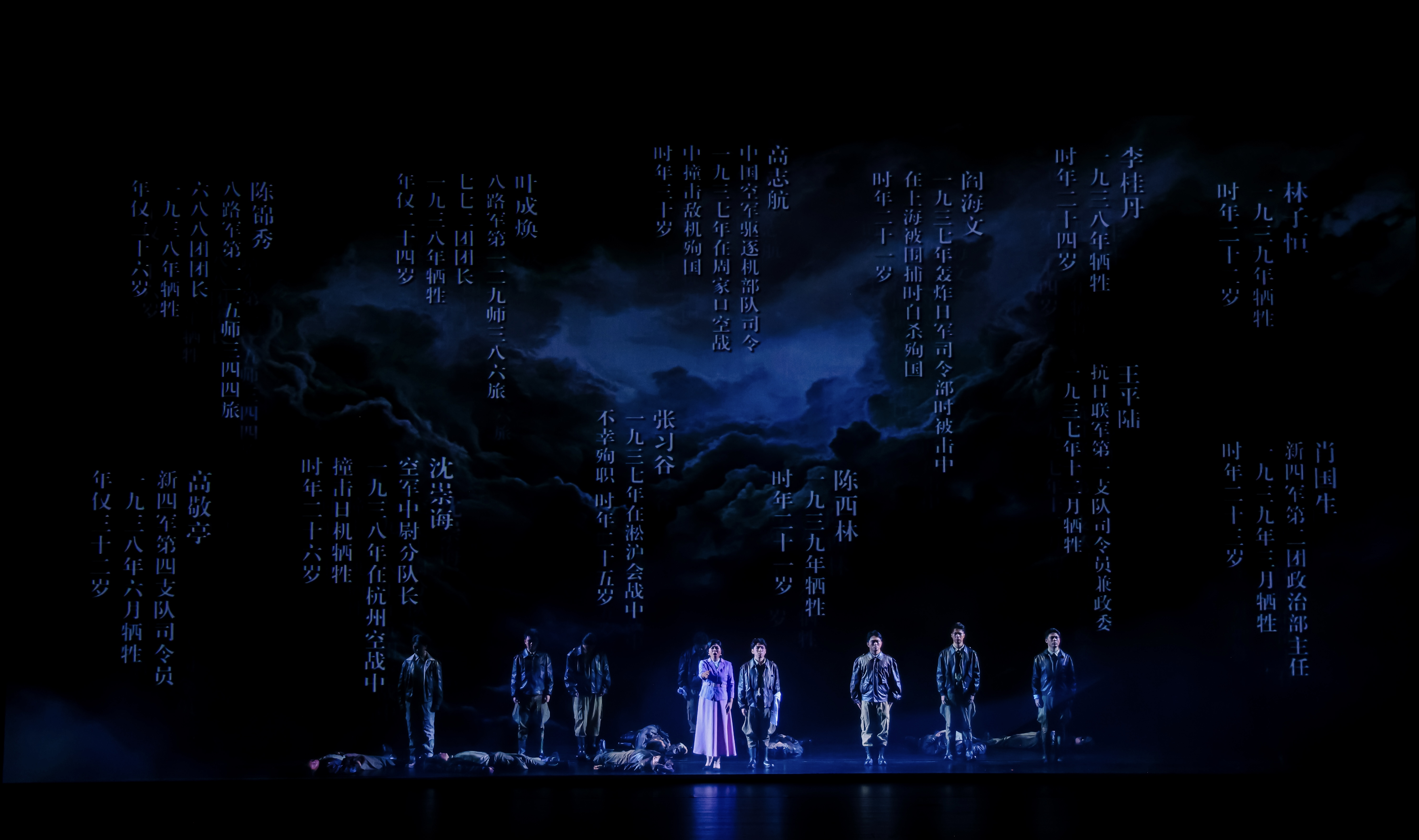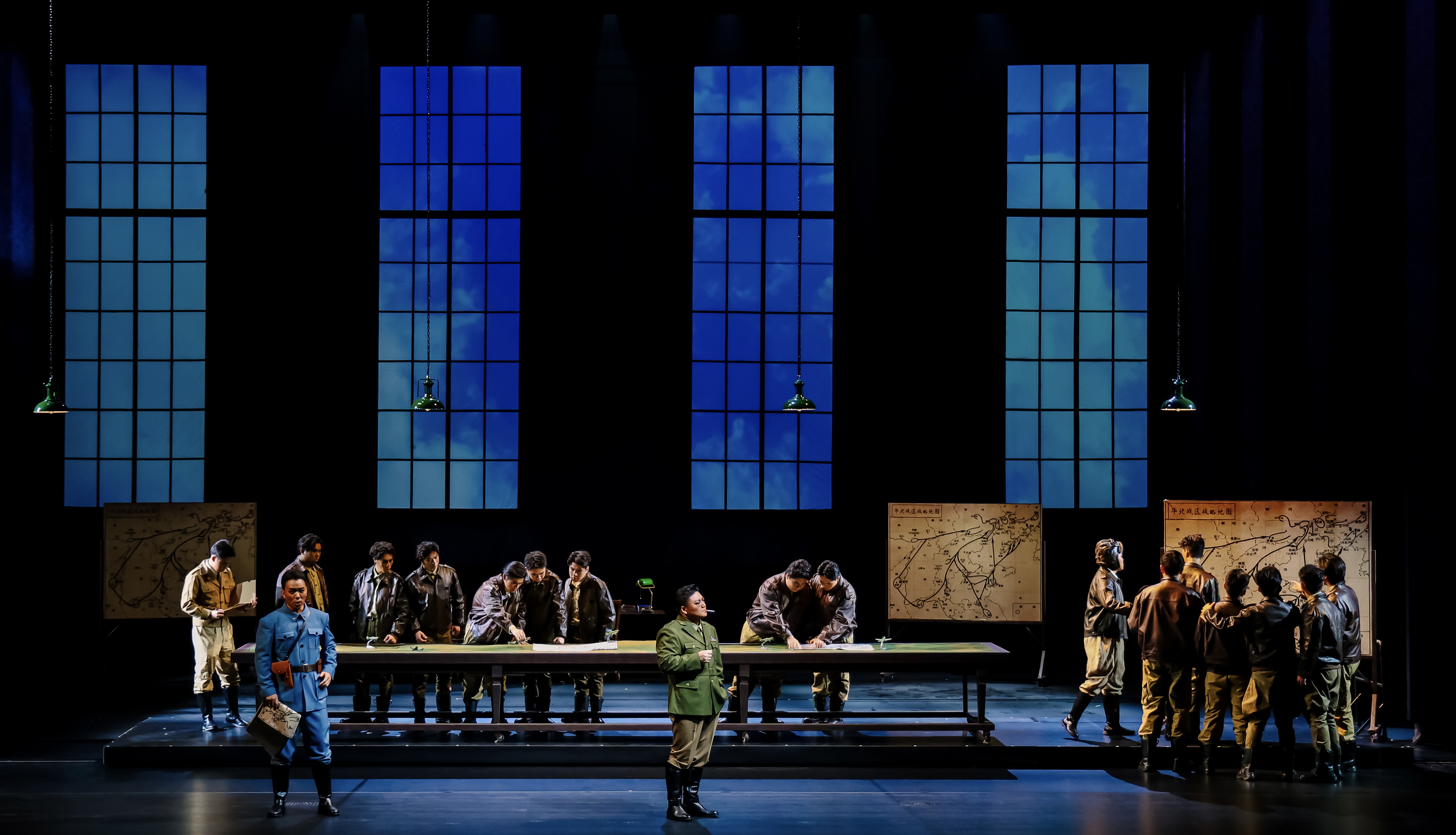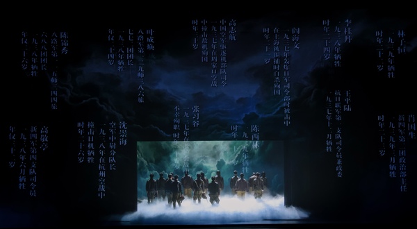 “本剧情景多、变化频繁、多时空并列,迁换需要快速高效。”丁丁介绍,为此,他在舞台三分之一深处,设置了一组可以开合的“云”景片,在深度上分割舞台空间,功能上则保证前区演出时后区换景的遮挡需要,“云开云合”完成瞬间的空间重组、传递信息和情感,增强艺术感和观赏性。加之现场以冷峻的钢铁结构象征战争的残酷与男性的阳刚,配合多媒体技术营造空战的激烈效果,最终呈现极具冲击力的视觉画面。