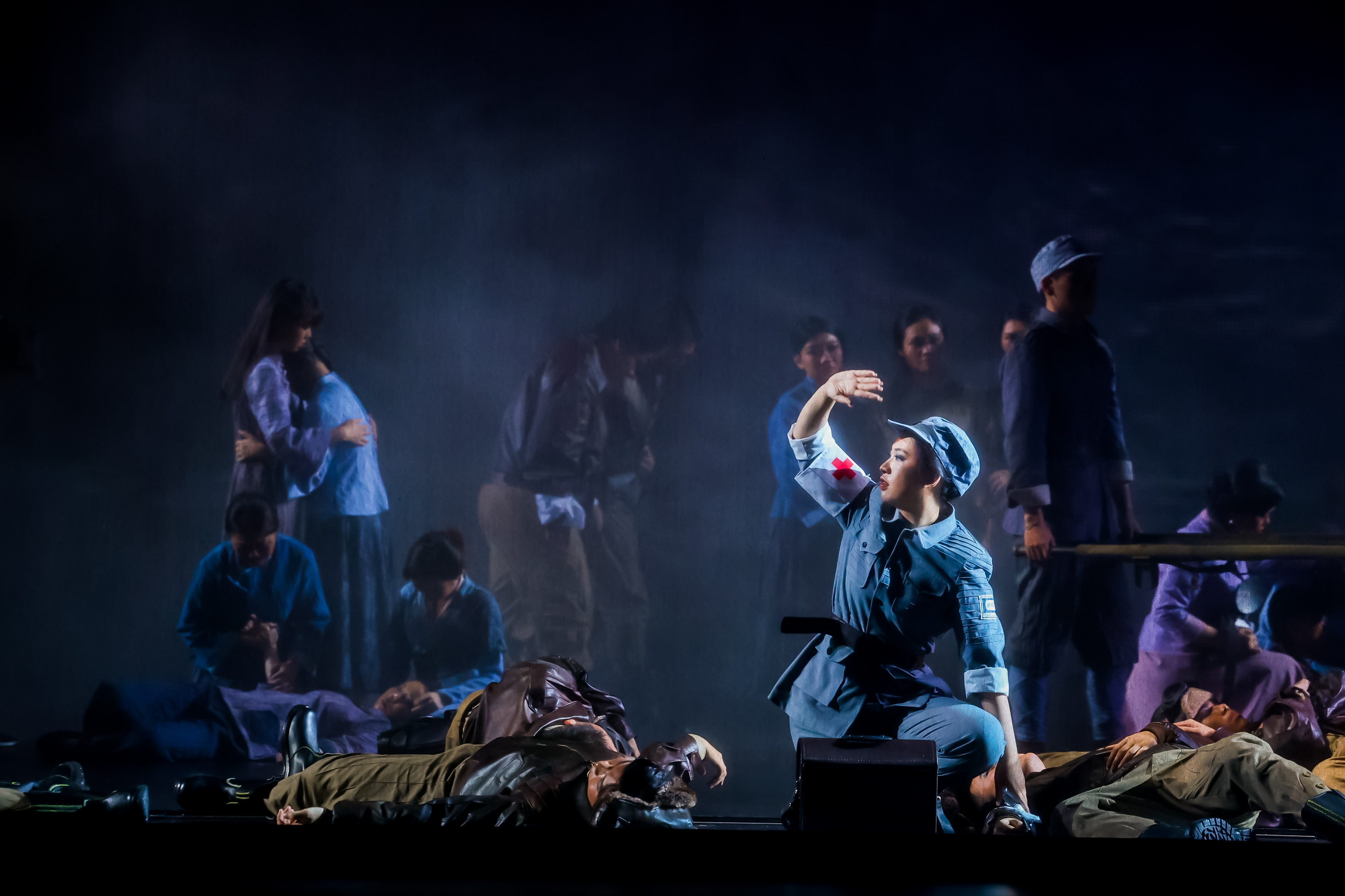 陈香梅的塑造则展现了战火中女性的坚韧与成长,她柔和的女性魅力为歌剧的阳刚之气增添了别样色彩。饰演者由声乐歌剧系教师方香蕾与歌剧学院的两名学员金凡雅、多莉雅共同完成。方香蕾关注人物情绪的内在逻辑和真实本质:“通过深入内心,理清内在逻辑,再用内心激发声音和身体的外在表达。”金凡雅则在排练演出中不断深入角色内心,细化表演的每一个动作。刚上本科二年级的多莉雅则更注重寻找她与陈香梅的共通之处,“陈香梅成为记者时,跟我一样也是20岁。”这是她出演的第一部歌剧,在老师们“手把手”的教导下迅速成长。“老师们的表演直击内心,让我真切体会到歌剧演员的魅力,也对歌剧表演有了全新的理解。”