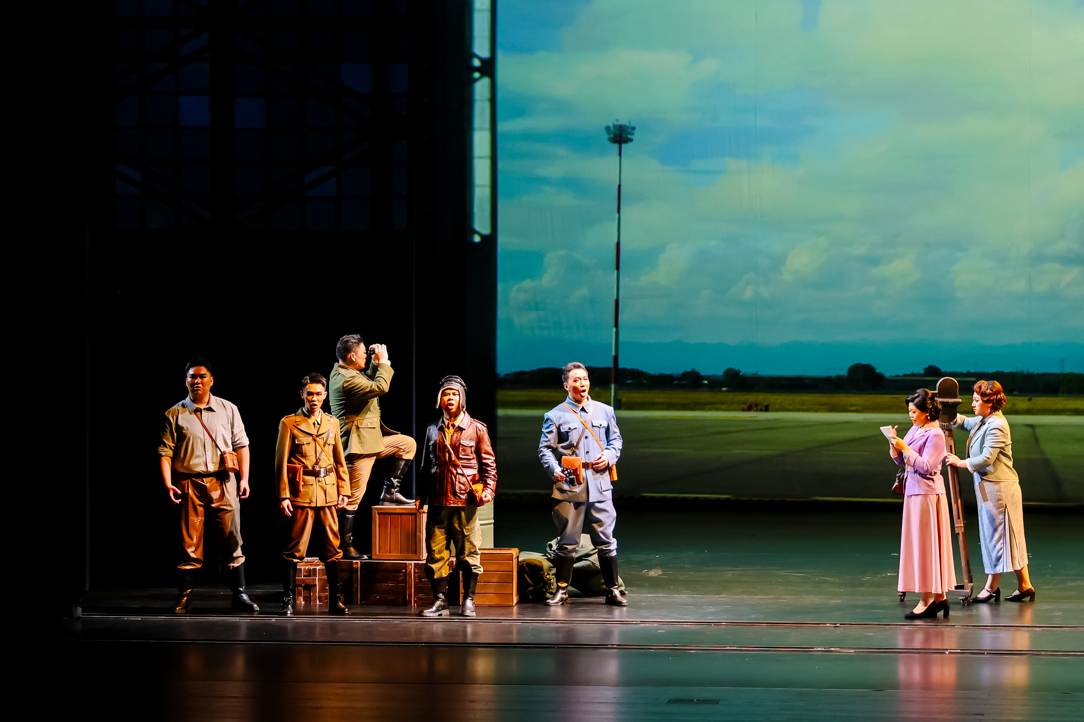 该剧对历史人物进行了深入肌理的刻画。饰演陈纳德的男高音歌唱家韩蓬,为角色倾注了大量心血。“我深知这不仅仅是在扮演一位历史英雄,更是在诠释一段跨越国界的勇气、责任与人性纠葛的史诗。”他通过大量阅读史料、观摩影像,观察其走路的姿态、说话的神情、微笑的样子,甚至“眼神中那种混合着坚毅、疲惫与执着的独特气质”,力图还原一个“有决心、有焦虑、有柔情、有反思”的复杂个体。“陈纳德是一个在极端环境下,被责任、勇气和巨大牺牲所塑造的、充满悲剧色彩的英雄。因此在我看来,表演不在于唱出多么震撼的高音,而在于是否让观众相信,舞台上的我就是那个在历史的十字路口,背负着沉重使命,却依然选择为信念而飞的‘飞虎将军’。”